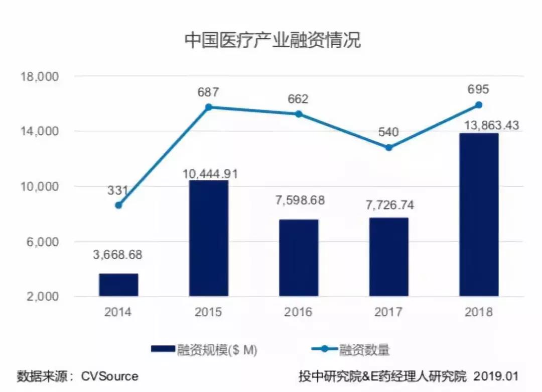 在E藥經(jīng)理人研究院和投中研究院聯(lián)合出品的《2019醫(yī)療產(chǎn)業(yè)投資指南》中,通過數(shù)據(jù)的分析發(fā)現(xiàn),從2014年至2018年中國醫(yī)療產(chǎn)業(yè)完成融資數(shù)量由331家增長到695家,2015年醫(yī)療產(chǎn)業(yè)融資有過爆發(fā)式的增長,在2016、2017年融資數(shù)量、規(guī)模放緩、趨于平穩(wěn)后,2018年融資數(shù)量較2017年有了顯著的提升,略有超過2015年峰值。 2018年融資規(guī)模大幅上升,同比增長79.42%。平均單筆交易額超越2015年1500萬美元,達到歷史新高1995萬美元。